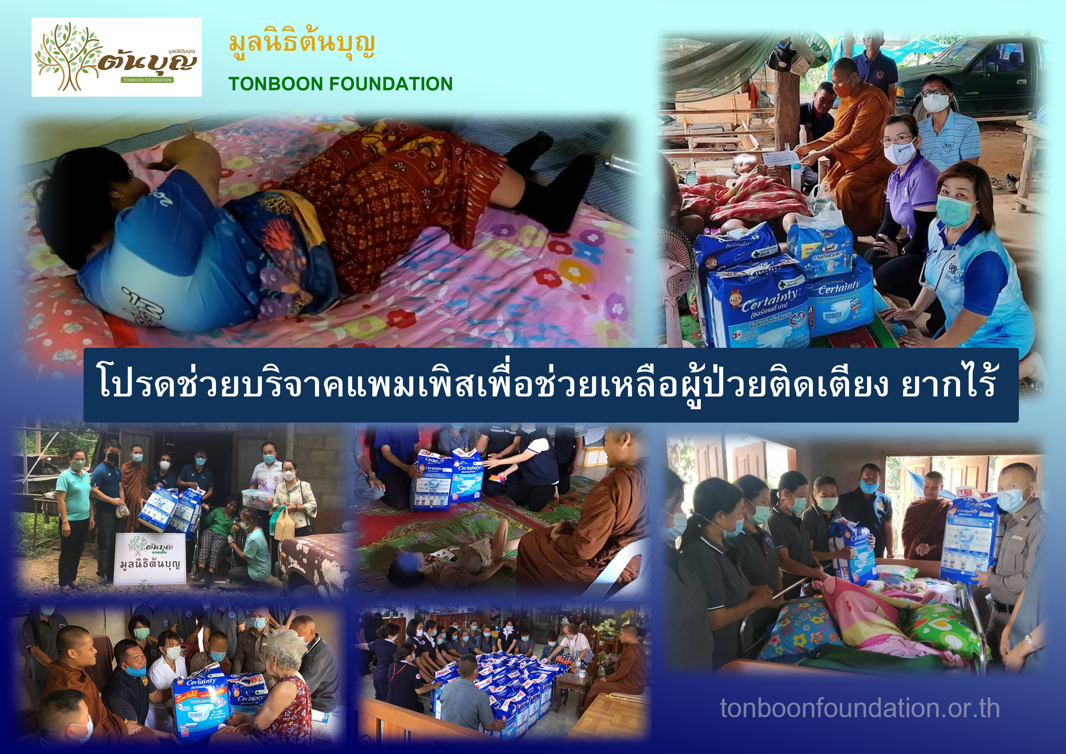 อีกหนึ่งโครงการเพื่อการกุศล ทางมูลนิธิต้นบุญได้เห็นถึงความสำคัญของการเข้าไปช่วยเหลือผู้ป่วยติดเตียง ผู้ป่วยพิการ ที่มีปัญหาความยากจน
